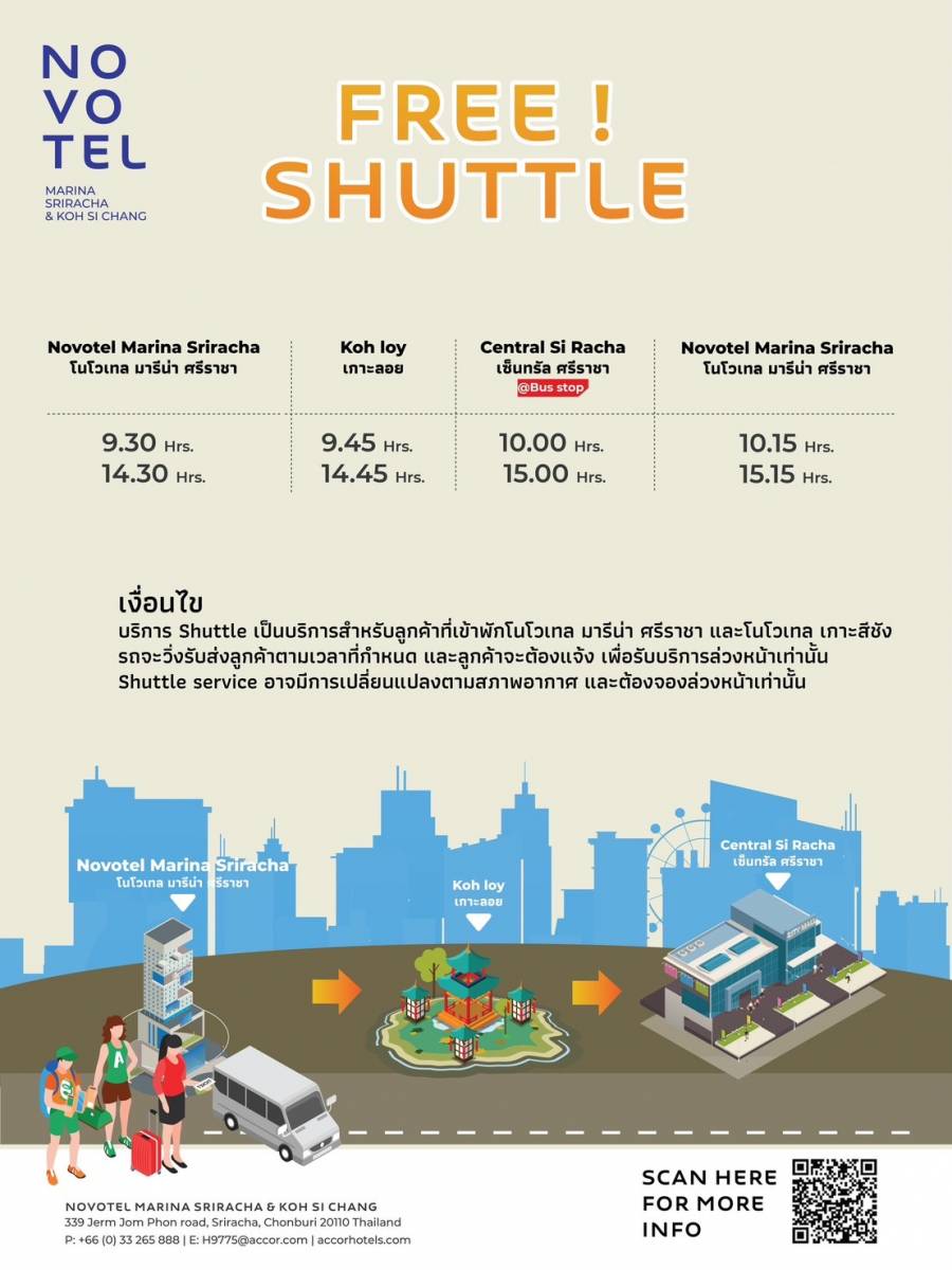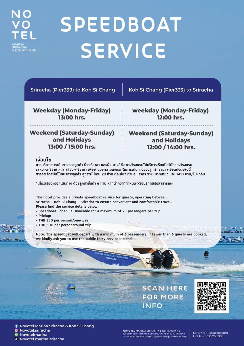 คำตอบ ทางโรงแรมมีบริการเรือสปีดโบ๊ทรับ-ส่ง โดยลูกค้าสามารถขึ้นที่ท่าเรือ 339 ของโรงแรมโนโวเทล มารีน่า ศรีราชา
